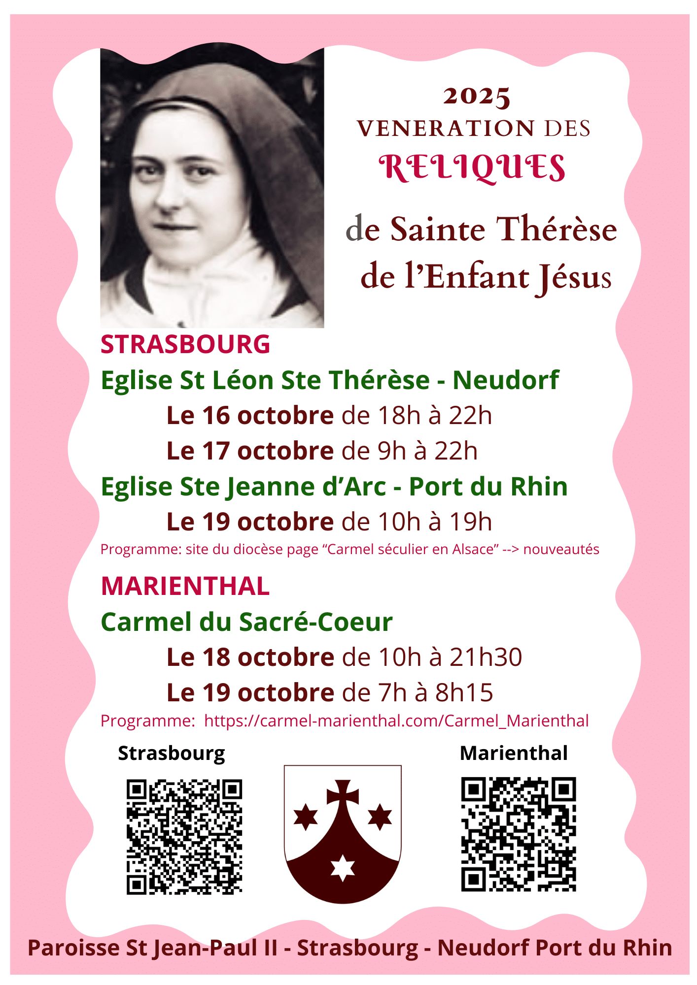 « Les reliques de Ste Thérèse de l’Enfant Jésus arrivent à Strasbourg le 16 octobre et en repartent le lundi matin 20 octobre tôt. Elles iront à l’église St Léon, puis au carmel de Marienthal, et enfin à l’église Ste Jeanne d’Arc.